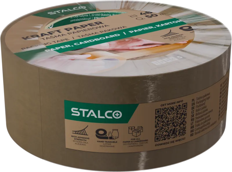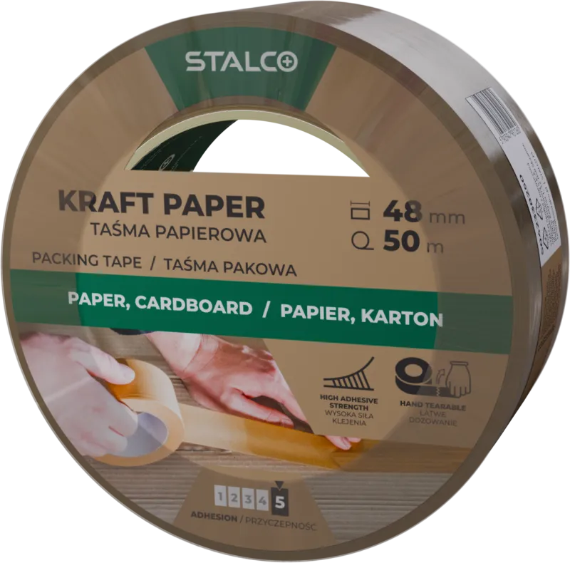 Papierová baliaca páska STALCO je ekologická alternatíva k tradičným plastovým páskam, ktorá nachádza široké uplatnenie pri balení zásielok a kartónov. Je vyrobená z odolného papiera kraft vysokej gramáže, ktorý sa vyrába z nebielenej celulózy a vyznačuje sa vysokou odolnosťou proti rozťahovaniu a roztrhnutiu. Papier kraft je cenený pre svoju prirodzenú trvanlivosť a ekologický charakter. Produkt sa osvedčil v domácnosti, kancelárii, sklade aj v dielňach. Pásku možno ľahko odtrhnúť rukou a zároveň zaisťuje vysokú priľnavosť (5/5) k väčšine povrchov: drevu, lepenke, fólii, plastu, kovu a podlahám.