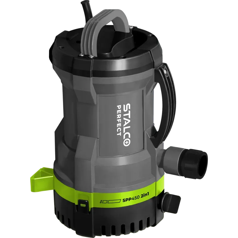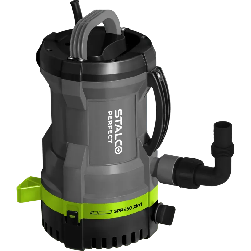 Ponorné čerpadlo na špinavú vodu STALCO PERFECT SPP450-2in1 je všestranné zariadenie 2v1, ktoré dokáže pracovať nielen ako klasické ponorné čerpadlo, ale aj ako záhradné (povrchové) čerpadlo umiestnené mimo nádrže s vodou. Toto riešenie umožňuje flexibilne prispôsobiť spôsob prevádzky aktuálnym podmienkam a druhu vykonávanej práce, bez nutnosti použitia dvoch samostatných zariadení.