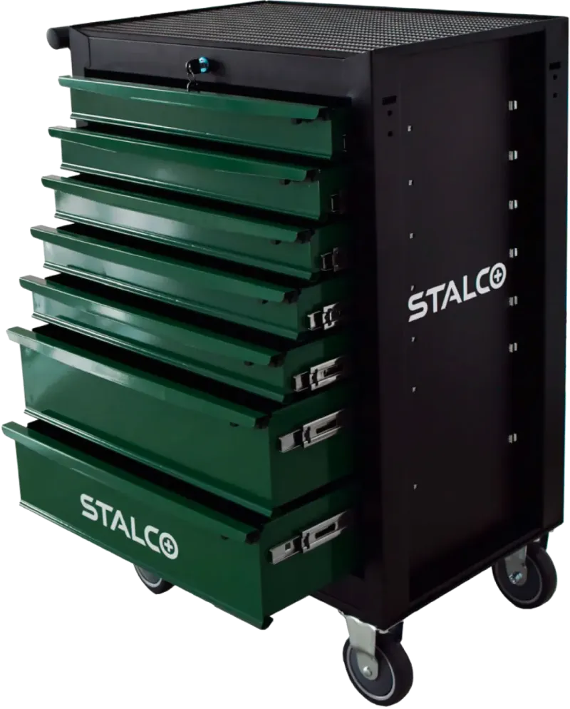 Profesionálny dielenský vozík STALCO (7 zásuviek) s nosnosťou 280 kg. Horná doska s odolnou podložkou, centrálny zámok, perforované boky. Guličkové ložiská, EVA vložky v zásuvkách.