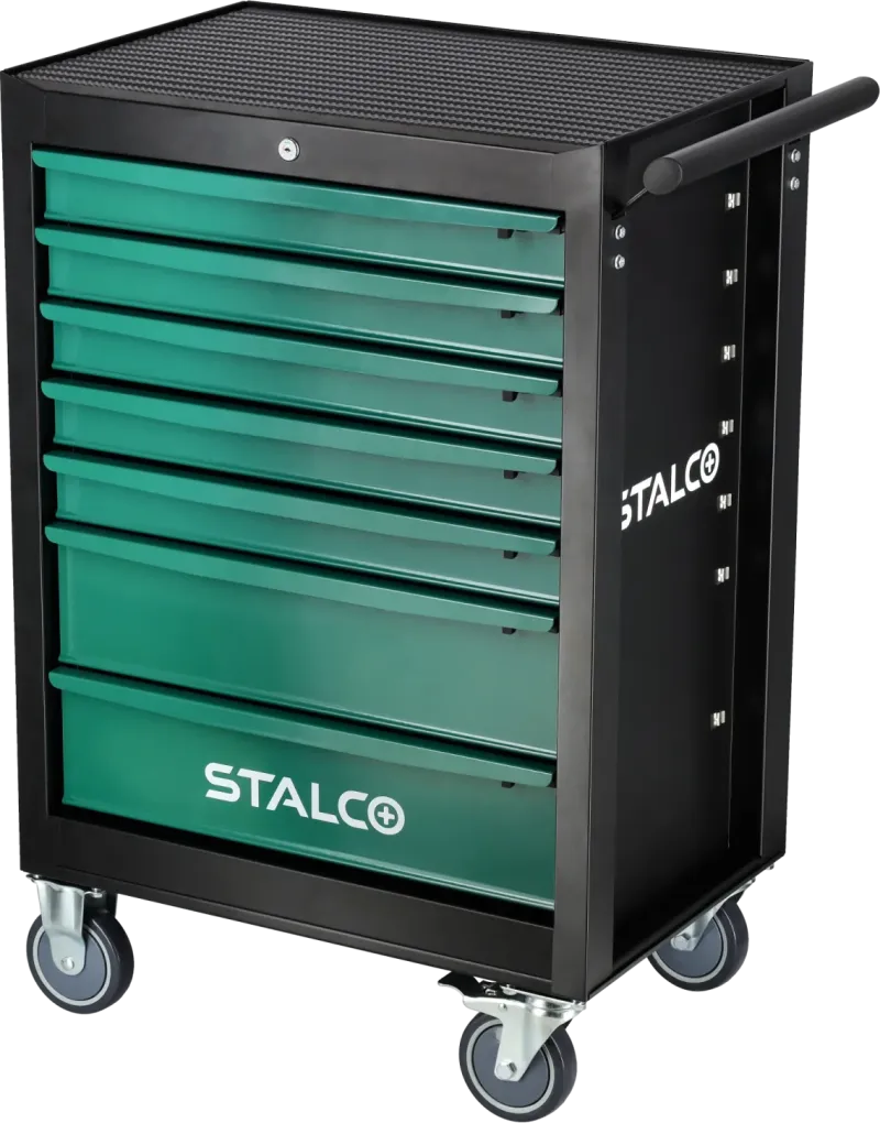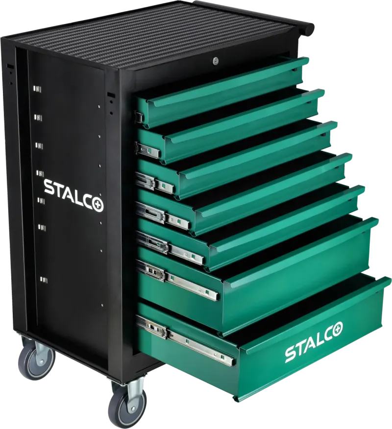 Vybavený dielenský vozík STALCO (model skrinky S-42252) je komplexným riešením pre každú dielňu. Obsahuje 169-dielnu súpravu profesionálneho náradia, ktorá je prehľadne uložená v kvalitných penových moduloch (EVA). Vozík má 7 zásuviek s centrálnym zamykaním, perforované boky a pracovnú dosku s odolnou podložkou.
