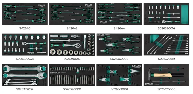 Kompletne vybavený dielenský vozík STALCO (S-42252) obsahujúci 165-dielnu súpravu náradia v EVA penových vložkách. Obsahuje gola súpravy (1/4", 3/8", 1/2"), kľúče, skrutkovače, kliešte a bity.