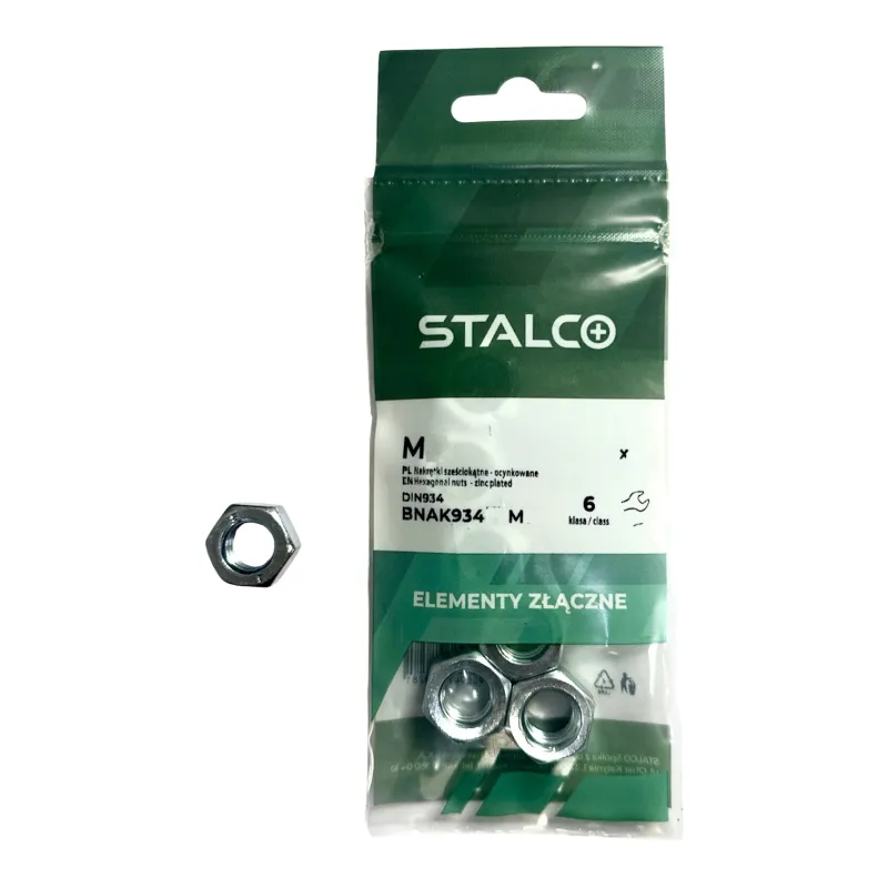 Šesťhranné matice STALCO podľa normy DIN 934 (PN M-82144, ISO 4032) v triede pevnosti 6 sú univerzálne spojovacie prvky pokryté vrstvou zinku pre ochranu proti korózii.