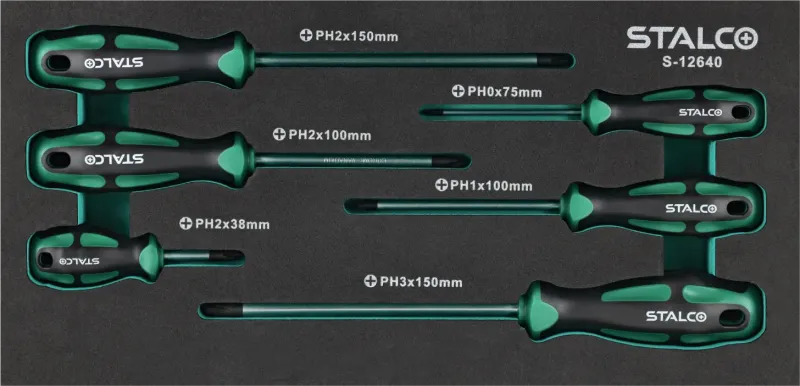 Súprava krížových skrutkovačov PHILLIPS (6-dielna) uložená v EVA pene. Táto súprava je navrhnutá ako vložka do dielenských skriniek STALCO (modely S-42250, S-42252).