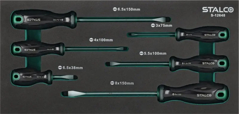 Súprava plochých skrutkovačov (6-dielna) v penovej vložke EVA. Táto sada je navrhnutá ako vložka do dielenských skriniek STALCO (modely S-42250, S-42252).