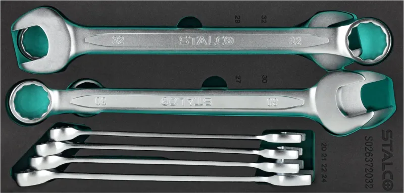 Súprava očkoplochých kľúčov (8-dielna) pre väčšie priemery, uložená v EVA pene. Obsahuje rozmery od 20 do 32 mm. Kľúče sú vyrobené z kvalitnej CrV ocele. Vložka pasuje do skriniek STALCO (S-42250, S-42252).
