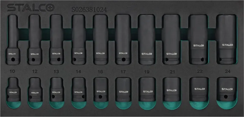 Súprava rázových hlavíc 1/2" (20-dielna) uložená v EVA pene. Tieto hlavice sú vyrobené z vysoko kvalitnej CrMo ocele (chróm-molybdén), ktorá zaisťuje odolnosť voči rázom a dlhú životnosť pri použití s rázovými uťahovákmi. Vložka pasuje do skriniek STALCO (S-42250, S-42252).
