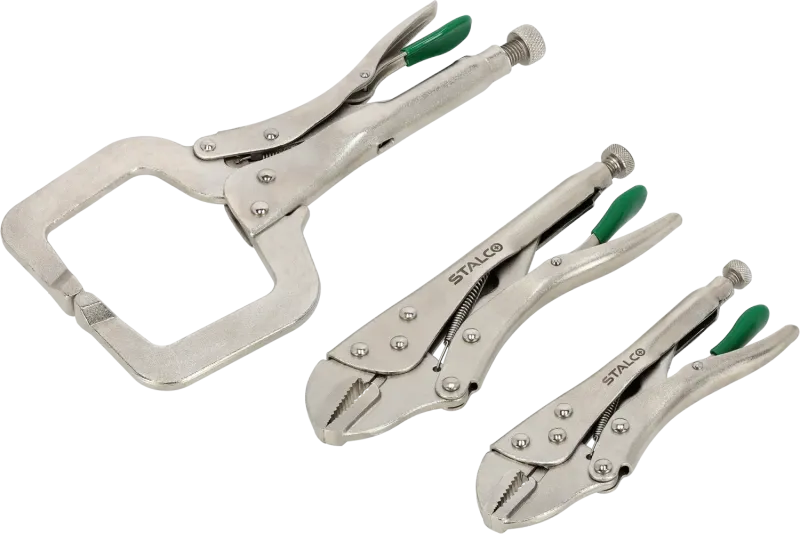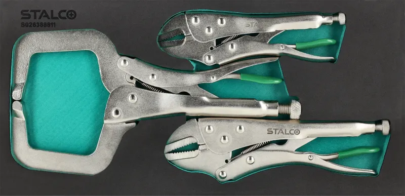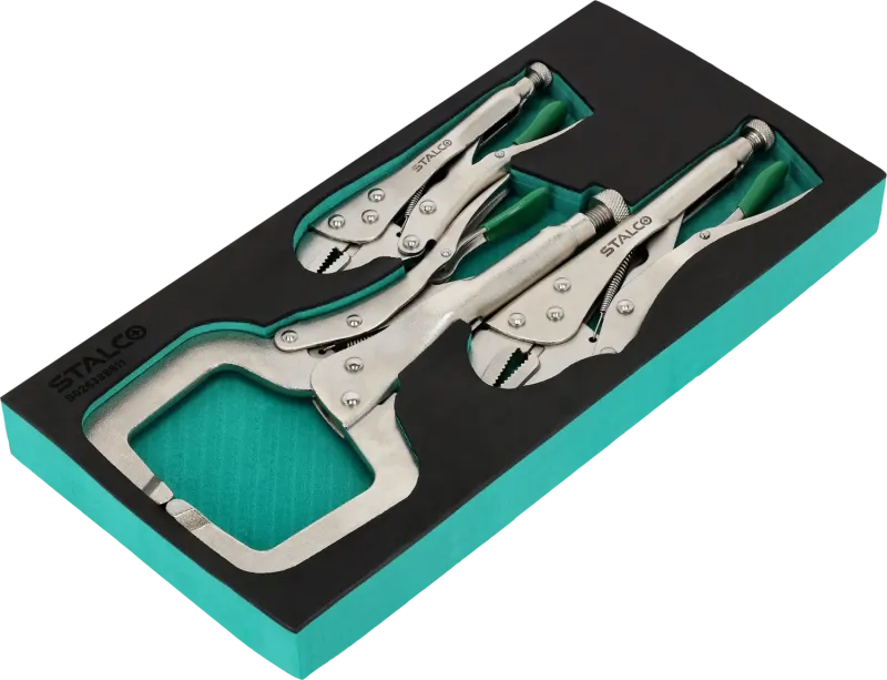 Súprava samosvorných (upínacích) klieští (3-dielna) uložená v EVA pene. Tieto kliešte sú neoceniteľné pri zváraní, brúsení alebo pridržiavaní materiálu. Vložka pasuje do všetkých dielenských skriniek STALCO.