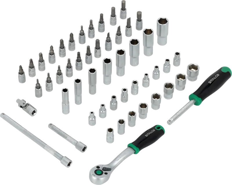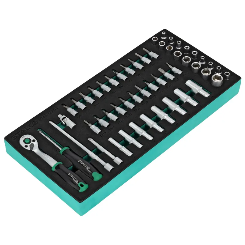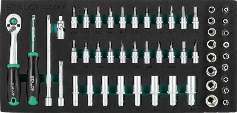 Komplexná 53-dielna súprava 1/4" nástrčných kľúčov STALCO v EVA pene. Obsahuje račňu (90 zubov), predĺženia, kĺb, skrutkovač a širokú škálu bitov na hlaviciach. Vložka do dielenských vozíkov.
