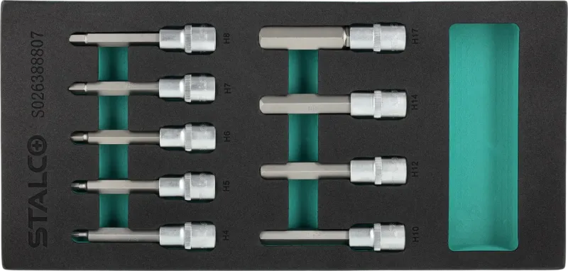 Súprava 9 ks predĺžených zástrčných hlavíc HEX (H4-H17) v EVA pene. Dĺžka 100 mm, pohon 1/2". Materiál S2/CrV. Vložka do dielenských vozíkov.
