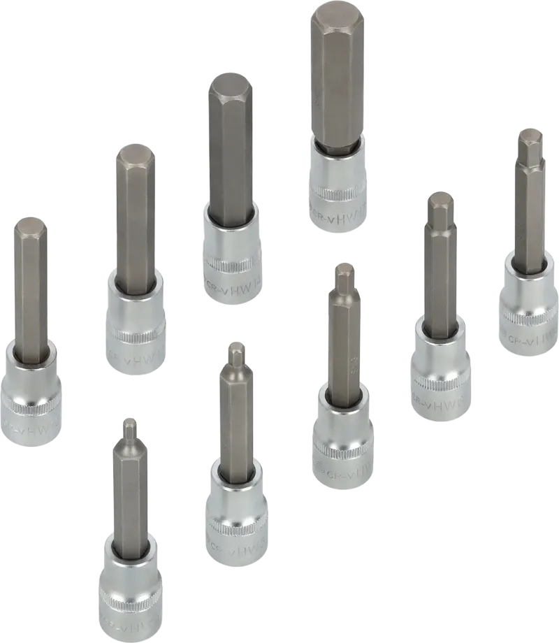 Súprava bitov HEX (Imbus) na 1/2" hlaviciach (9 dielov) uložená v EVA pene. Súprava je určená na povoľovanie a uťahovanie skrutiek so šesťhranným otvorom. Vďaka dĺžke 100 mm je ideálna pre prácu v hlbších otvoroch. Vhodná pre autoservisy, dielne a montáž.