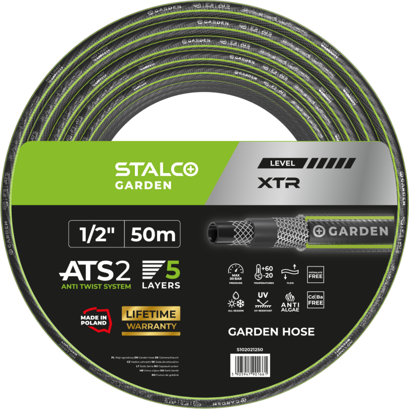 Vysokokvalitná 5-vrstvová záhradná hadica STALCO GARDEN ATS XTR s protišmykovým systémom ATS 2, odolná voči UV žiareniu, chemikáliám a tlaku do 30 bar. Určená na profesionálne aj domáce zavlažovanie.