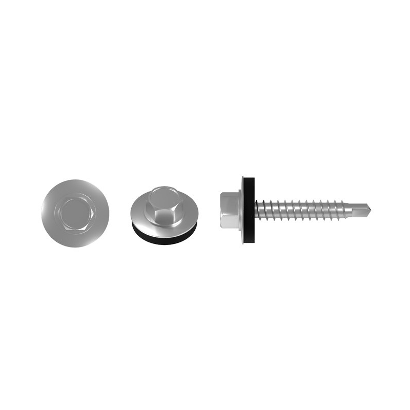 Skrutka je vyrobená z galvanicky pozinkovanej uhlíkovej ocele, čo jej zaisťuje ochranu proti korózii. Je vybavená špeciálnym samovŕtacím hrotom (vŕtacia kapacita do 2 mm hrúbky plechu), ktorý umožňuje montáž bez predvŕtavania, a šesťhrannou hlavou pre jednoduchú a rýchlu inštaláciu pomocou uťahovačky. Neoddeliteľnou súčasťou je oceľová podložka s navulkanizovaným tesnením z EPDM gumy. Toto tesnenie je odolné voči poveternostným vplyvom a UV žiareniu, dokonale priľne k povrchu a vytvára vodotesný spoj, ktorý chráni konštrukciu pred prenikajúcou vlhkosťou.