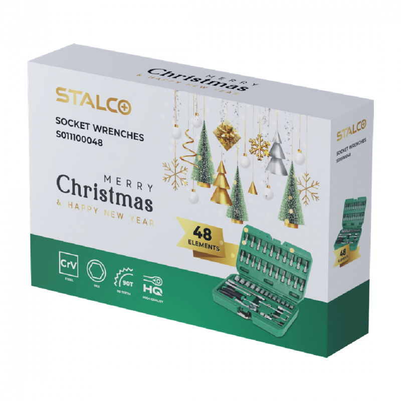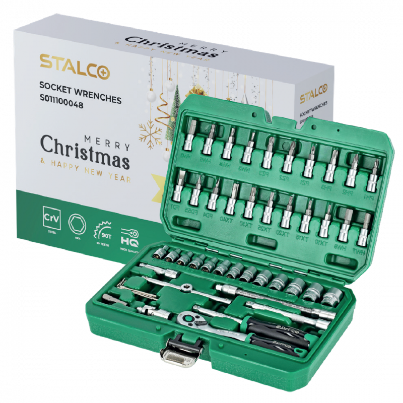 48-dielna gola súprava STALCO (1/4") v darčekovom balení. Račňa s 90 zubami, hlavice 4-14 mm, zástrčné hlavice (bity) a príslušenstvo. CrV oceľ.