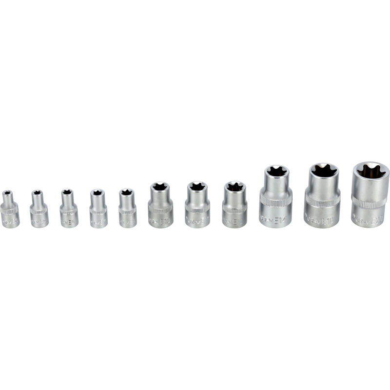 Praktická 11-dielna sada nástrčných hlavíc TORX (E-profil) vo veľkostiach 1/4", 3/8" a 1/2". Vyrobené z kvalitnej CrV ocele pre vysokú odolnosť a dlhú životnosť. Dodávané v praktickom organizéri.
