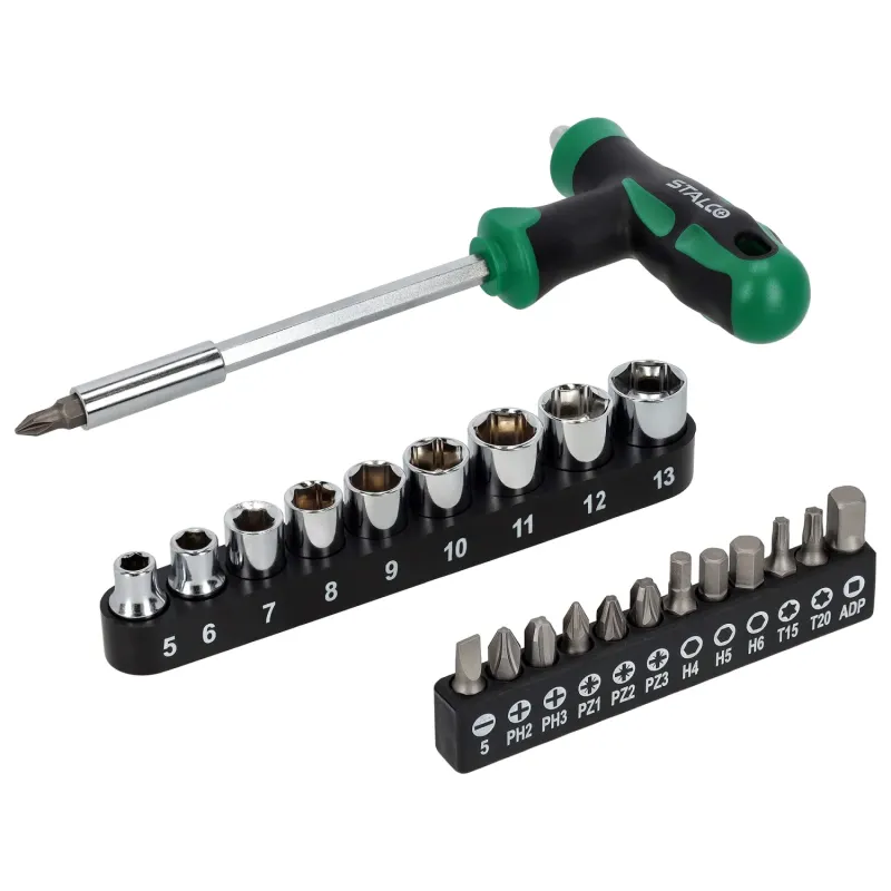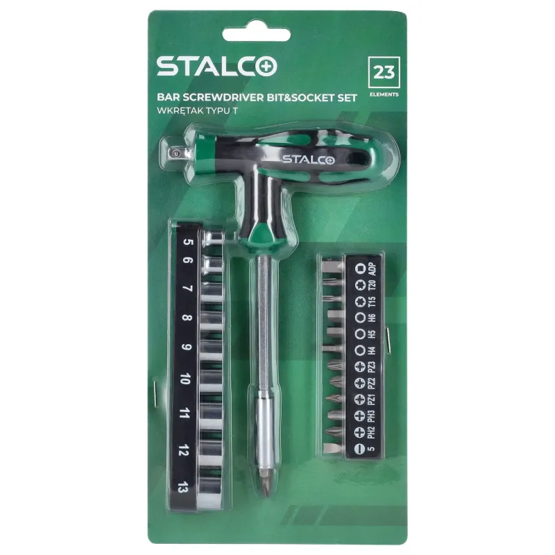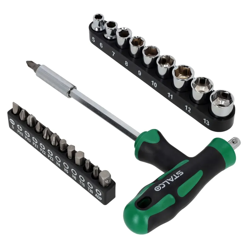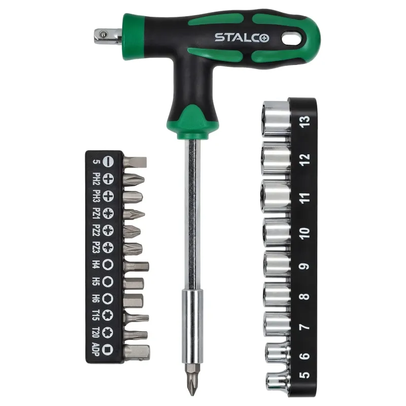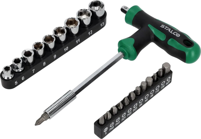 23-dielna súprava s T-skrutkovačom STALCO. Obsahuje bity a hlavice 1/4". Ergonomická priečna rukoväť, magnetické uchytenie, CrV oceľ.