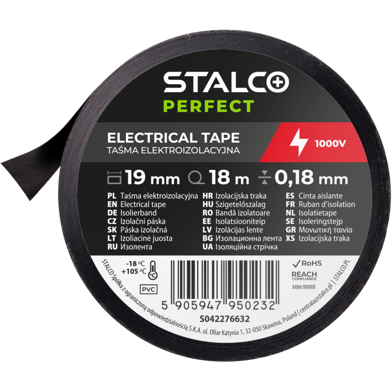 Profesionálna PVC izolačná páska STALCO PERFECT. Vyznačuje sa najvyššou kvalitou a flexibilitou. Je samozhášavá, mimoriadne trvácna a odolná voči vode, mrazu, UV žiareniu, olejom a chemikáliám. Pracuje v širokom teplotnom rozsahu od -18°C do +105°C.