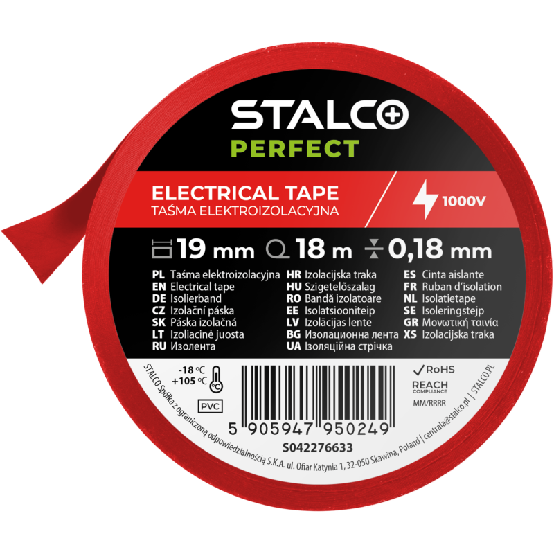 Profesionálna PVC izolačná páska STALCO PERFECT (19 mm x 18 m), červená. Hrúbka 0,18 mm. Samozhášavá, odolná voči UV, olejom a chladu (-18°C až +105°C).