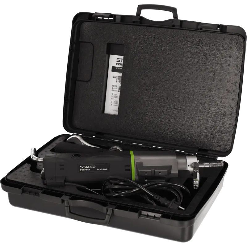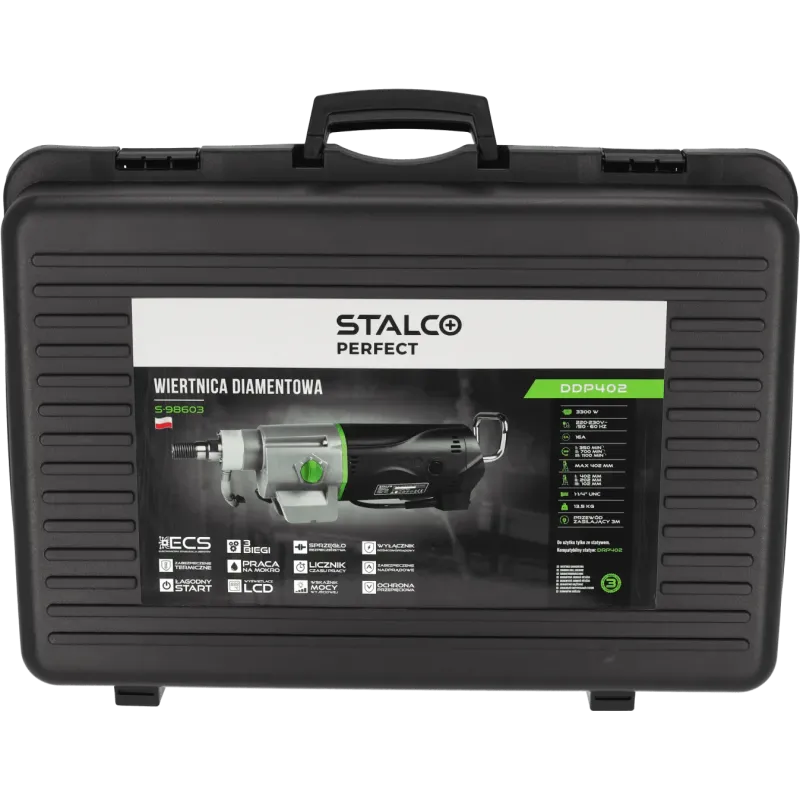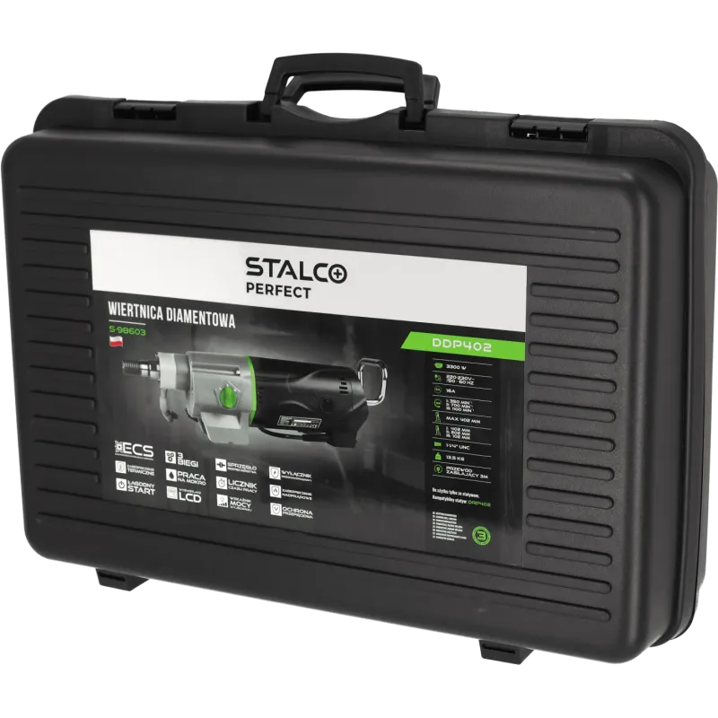 Profesionálna diamantová jadrová vŕtačka STALCO PERFECT DDP402 je najvýkonnejším strojom v ponuke elektronáradia STALCO. S masívnym výkonom 3300 W je určená na realizáciu tých najnáročnejších prestupov cez steny a stropy s obrovským priemerom až do 402 mm. Zariadenie je konštruované výhradne na prácu s vodným výplachom (na mokro).