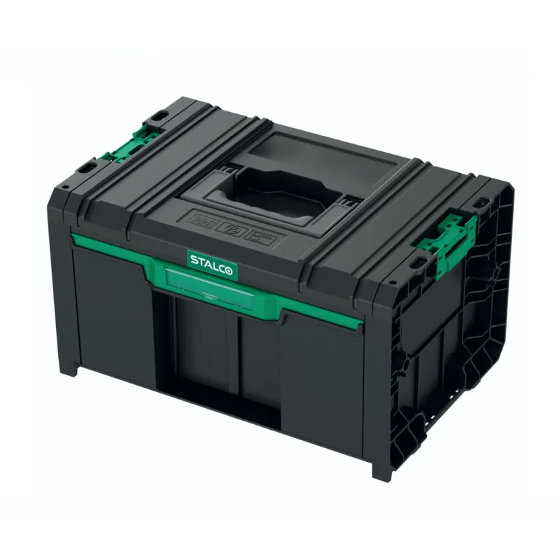 Zásuvkový modul STALCO SYSTEM TB01 s jednou extra hlbokou zásuvkou. Je navrhnutý pre bezpečné uloženie objemnejšieho náradia, ako sú uhlové brúsky, vŕtačky alebo väčšie sady kľúčov, priamo v modulárnej zostave.