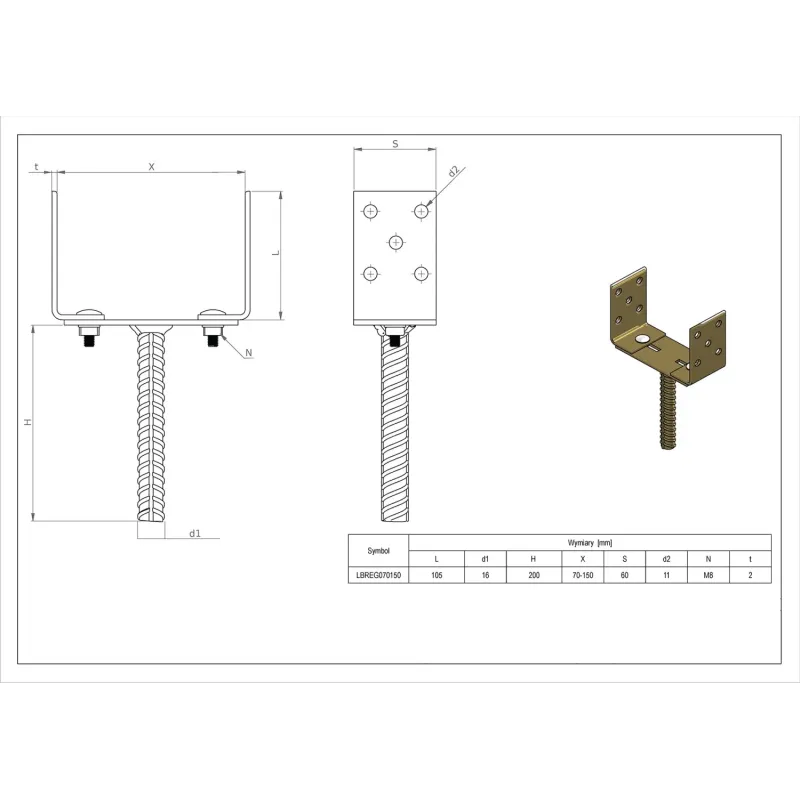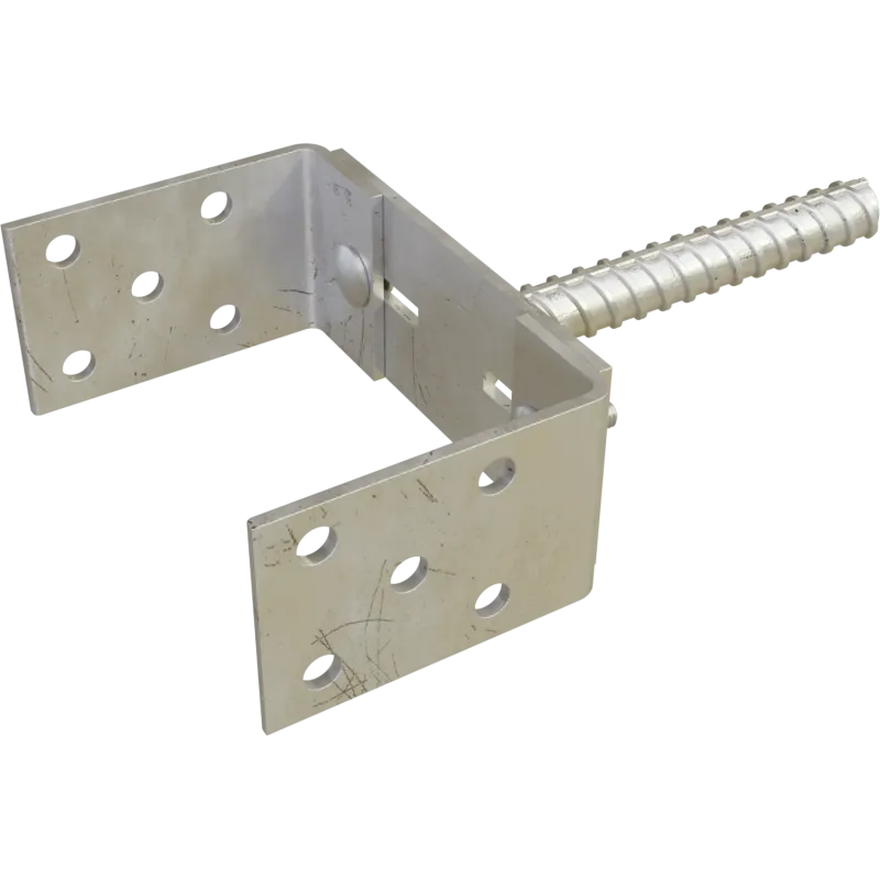 Nastaviteľná montážna konzola v tvare U (70 - 150 mm) na kotvenie drevených stĺpov do betónu. Žiarovo pozinkovaná oceľ s hrúbkou 4 mm zaručuje odolnosť a dilatačná medzera chráni drevo pred vlhkosťou.