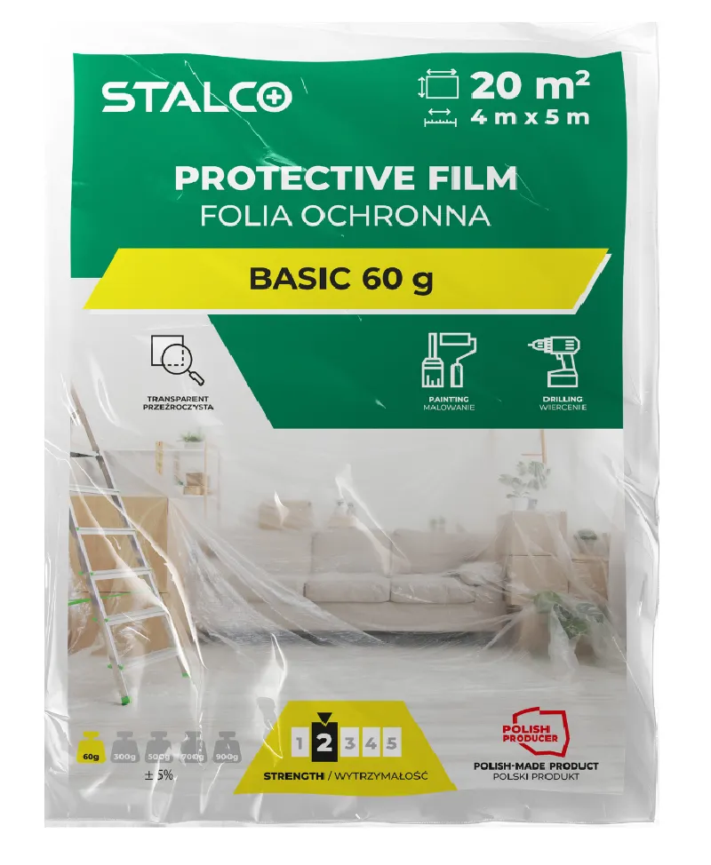 Ochranná fólia BASIC (transparentná) je najľahšou fóliou v ponuke (60 g). Je určená primárne ako zakrývacia fólia proti prachu a jemným nečistotám.