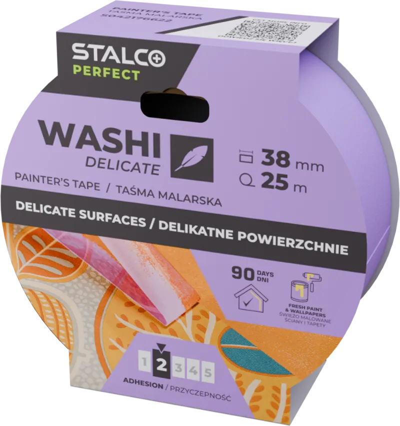 Jemná maliarska páska Washi DELICATE je profesionálna páska vyrobená z najkvalitnejšieho originálneho japonského papiera washi. Je určená pre mimoriadne precízne práce na povrchoch vyžadujúcich špeciálnu opatrnosť, ako je napríklad oddeľovanie okrajov tapiet pri maľovaní priľahlej steny alebo maskovanie na čerstvo natretých stenách (minimálne 3 hodiny po maľovaní). Zanecháva výnimočne presnú líniu bez podtekania farby. Vďaka svojej ultratenkej, hydrofóbnej a odolnej štruktúre sa dá ľahko odstrániť bez zanechania stôp lepidla a bez rizika poškodenia podkladu.