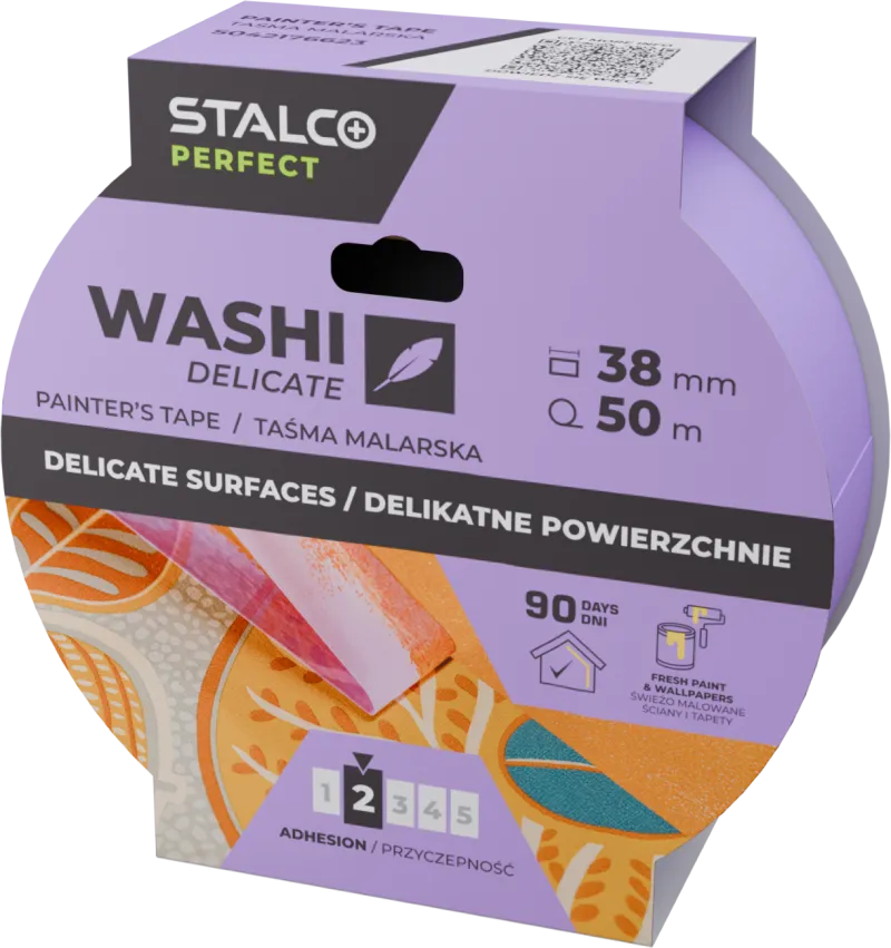 Jemná maliarska páska Washi DELICATE je profesionálna páska vyrobená z najkvalitnejšieho originálneho japonského papiera washi. Je určená pre mimoriadne precízne práce na povrchoch vyžadujúcich špeciálnu opatrnosť, ako je napríklad oddeľovanie okrajov tapiet pri maľovaní priľahlej steny alebo maskovanie na čerstvo natretých stenách (minimálne 3 hodiny po maľovaní). Zanecháva výnimočne presnú líniu bez podtekania farby. Vďaka svojej ultratenkej, hydrofóbnej a odolnej štruktúre sa dá ľahko odstrániť bez zanechania stôp lepidla a bez rizika poškodenia podkladu.