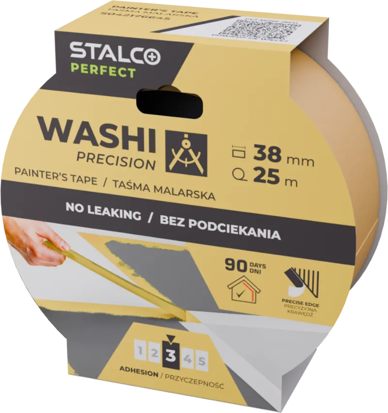 Precízna maliarska páska Washi PRECISION od STALCO PERFECT je vysokokvalitná profesionálna páska z originálneho japonského papiera washi, určená pre najnáročnejšie maliarske a dokončovacie práce v interiéroch. Vďaka ultratenkému, hydrofóbnemu a extrémne odolnému papieru washi zaisťuje perfektne ostré a čisté oddelenie farieb, čím eliminuje riziko podtekania farby. Vyznačuje sa veľmi dobrou priľnavosťou a po skončení maľovania sa dá ľahko odstrániť bez zanechania stôp lepidla alebo poškodenia podkladu. Zachováva si svoje vlastnosti aj v náročnejších podmienkach vďaka vysokej odolnosti voči UV žiareniu a vlhkosti.