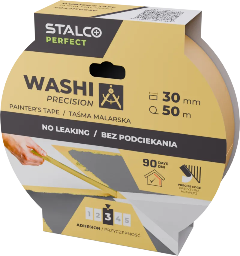 Precízna maliarska páska Washi PRECISION od STALCO PERFECT je vysokokvalitná profesionálna páska z originálneho japonského papiera washi, určená pre najnáročnejšie maliarske a dokončovacie práce v interiéroch. Vďaka ultratenkému, hydrofóbnemu a extrémne odolnému papieru washi zaisťuje perfektne ostré a čisté oddelenie farieb, čím eliminuje riziko podtekania farby. Vyznačuje sa veľmi dobrou priľnavosťou a po skončení maľovania sa dá ľahko odstrániť bez zanechania stôp lepidla alebo poškodenia podkladu. Zachováva si svoje vlastnosti aj v náročnejších podmienkach vďaka vysokej odolnosti voči UV žiareniu a vlhkosti.