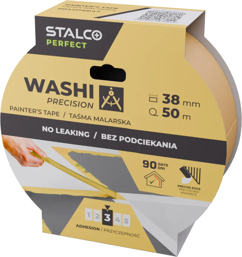 Precízna maliarska páska Washi PRECISION od STALCO PERFECT je vysokokvalitná profesionálna páska z originálneho japonského papiera washi, určená pre najnáročnejšie maliarske a dokončovacie práce v interiéroch. Vďaka ultratenkému, hydrofóbnemu a extrémne odolnému papieru washi zaisťuje perfektne ostré a čisté oddelenie farieb, čím eliminuje riziko podtekania farby. Vyznačuje sa veľmi dobrou priľnavosťou a po skončení maľovania sa dá ľahko odstrániť bez zanechania stôp lepidla alebo poškodenia podkladu. Zachováva si svoje vlastnosti aj v náročnejších podmienkach vďaka vysokej odolnosti voči UV žiareniu a vlhkosti.