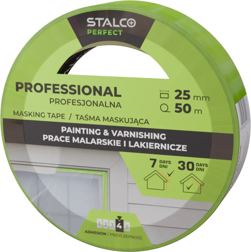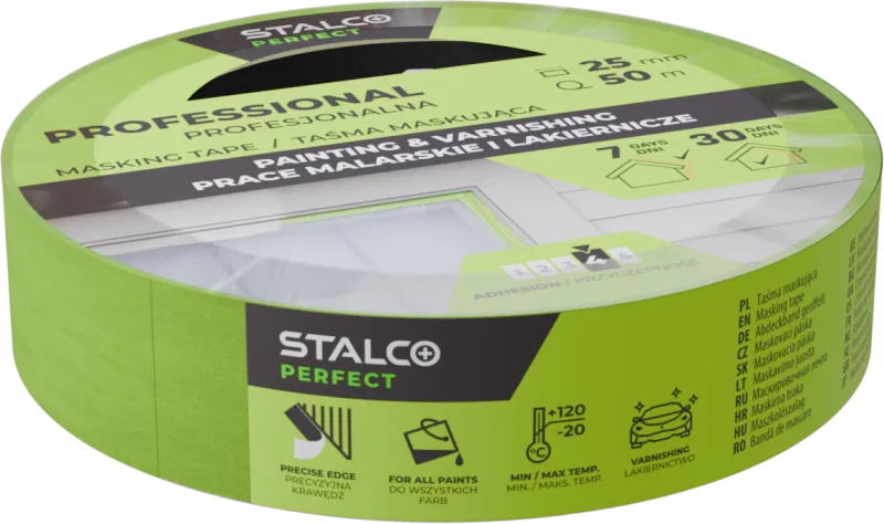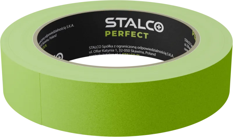 Profesionálna zelená maliarska páska STALCO PERFECT (25 mm x 50 m) z trojito voskovaného papiera. Zaručuje ultra ostré hrany. UV odolná 30 dní, tepelne odolná (120°C). Priľnavosť 4/5.