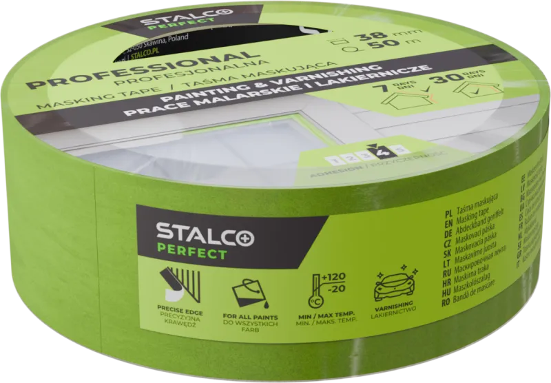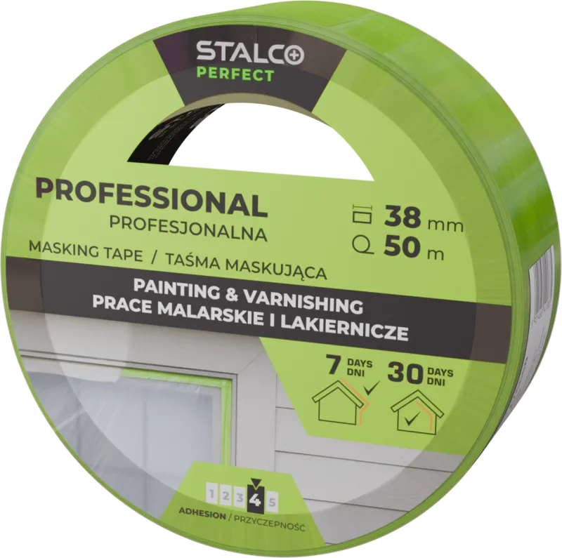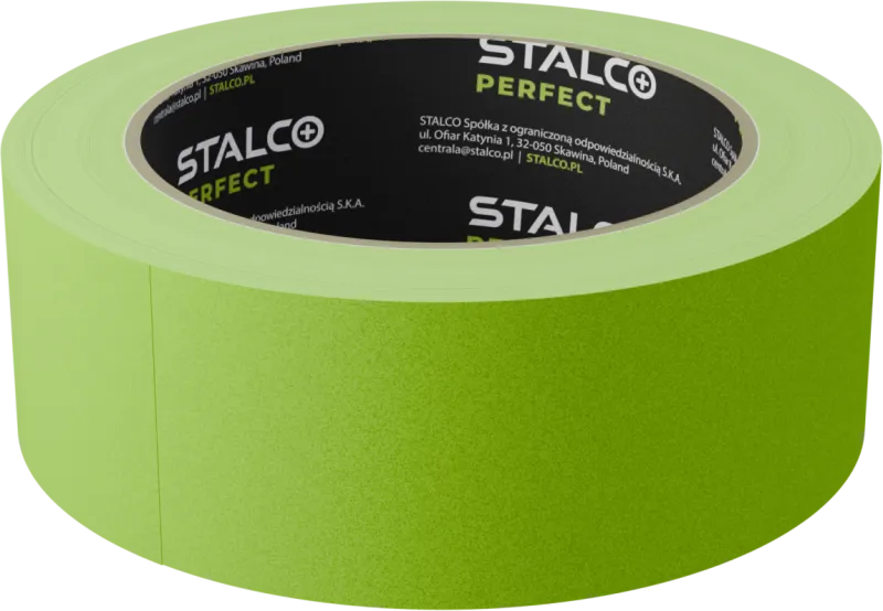 Profesionálna zelená maliarska páska STALCO PERFECT (38 mm x 50 m) z trojito voskovaného papiera. Zaručuje ultra ostré hrany. UV odolná 30 dní, tepelne odolná (120°C). Priľnavosť 4/5.