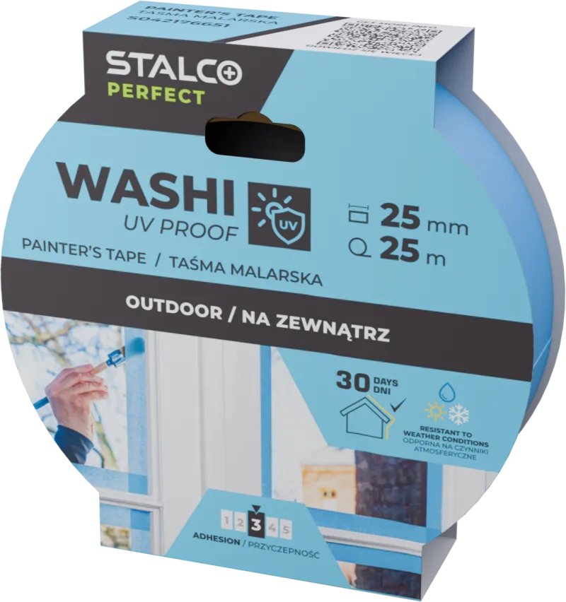 Maliarska páska Washi UV Proof STALCO PERFECT je profesionálna páska vyrobená z vysokokvalitného originálneho japonského papiera washi, určená pre precízne maliarske a dokončovacie práce v interiéri aj exteriéri. Umožňuje dosiahnuť výnimočne čisté, rovné maliarske hrany bez rizika podtekania farby. Vyznačuje sa zvýšenou odolnosťou voči vlhkosti, UV žiareniu (až 45 dní) a premenlivým teplotám. Osvedčila sa aj v miestnostiach so zvýšenou vlhkosťou (kúpeľne, práčovne). Tenký, hydrofóbny a odolný papier washi zaručuje presné oddelenie farieb.