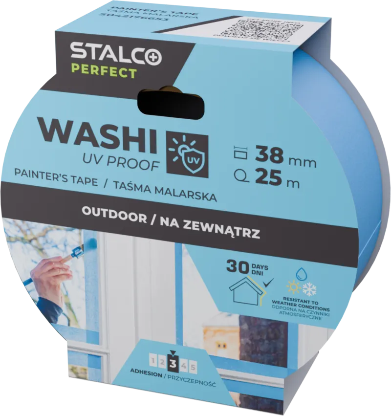 Maliarska páska Washi UV Proof STALCO PERFECT je profesionálna páska vyrobená z vysokokvalitného originálneho japonského papiera washi, určená pre precízne maliarske a dokončovacie práce v interiéri aj exteriéri. Umožňuje dosiahnuť výnimočne čisté, rovné maliarske hrany bez rizika podtekania farby. Vyznačuje sa zvýšenou odolnosťou voči vlhkosti, UV žiareniu (až 45 dní) a premenlivým teplotám. Osvedčila sa aj v miestnostiach so zvýšenou vlhkosťou (kúpeľne, práčovne). Tenký, hydrofóbny a odolný papier washi zaručuje presné oddelenie farieb.