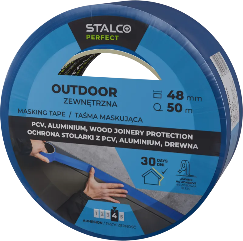 Profesionálna vonkajšia páska STALCO PERFECT (48 mm x 50 m). Vystužená PE fólia, UV odolná 90 dní, odstránenie do 30 dní bez lepidla. Odtrhnuteľná rukou, priľnavosť 4/5.
