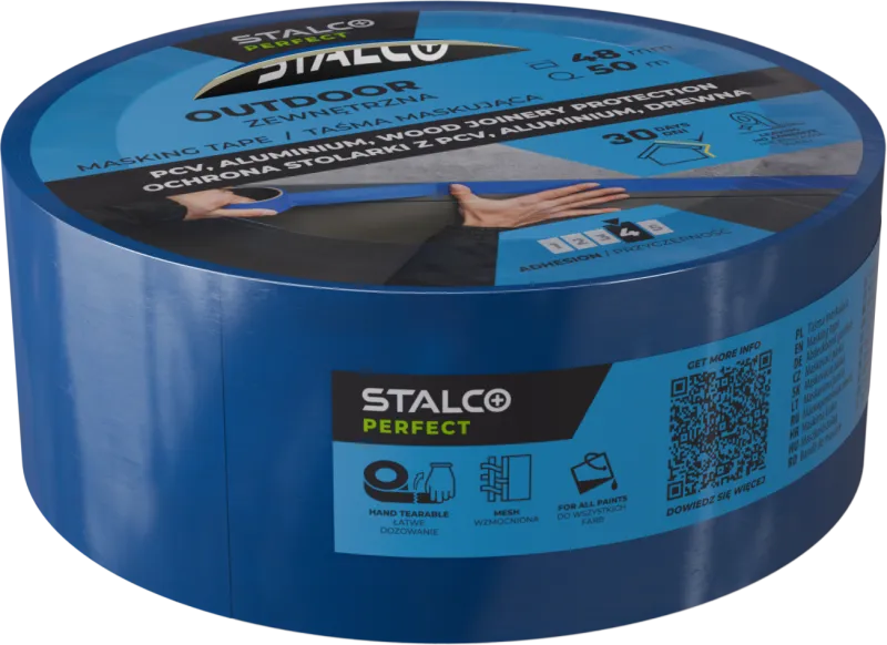Vonkajšia maskovacia páska STALCO PERFECT je špičková špecializovaná ochranná páska vyrobená z PE fólie vystuženej sieťovinou, čo zaisťuje jej výnimočnú trvácnosť a odolnosť voči mechanickému poškodeniu. Je určená pre náročné stavebné a dokončovacie práce, kde je kľúčová odolnosť voči intenzívnym poveternostným vplyvom, UV žiareniu (až 90 dní) a vlhkosti.