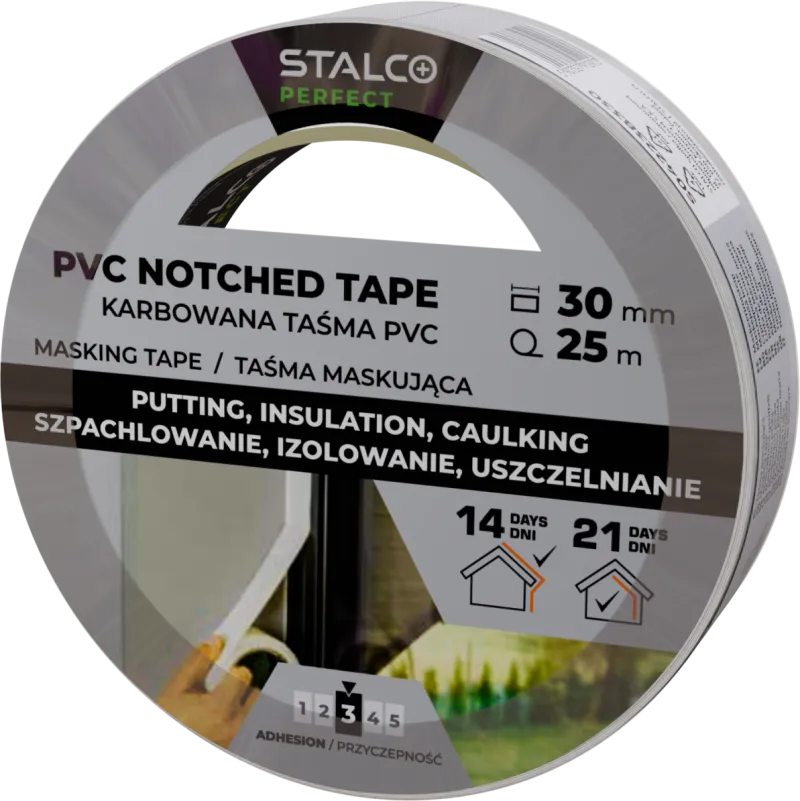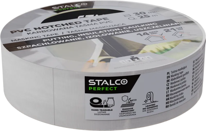 Špecializovaná vlnitá PVC páska STALCO PERFECT (30 mm x 25 m). UV odolná (14 dní), ľahko sa trhá rukou. Ideálna na ochranu okien pri omietaní a aplikácii peny. Priľnavosť 3/5.
