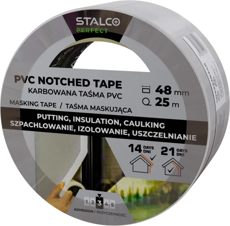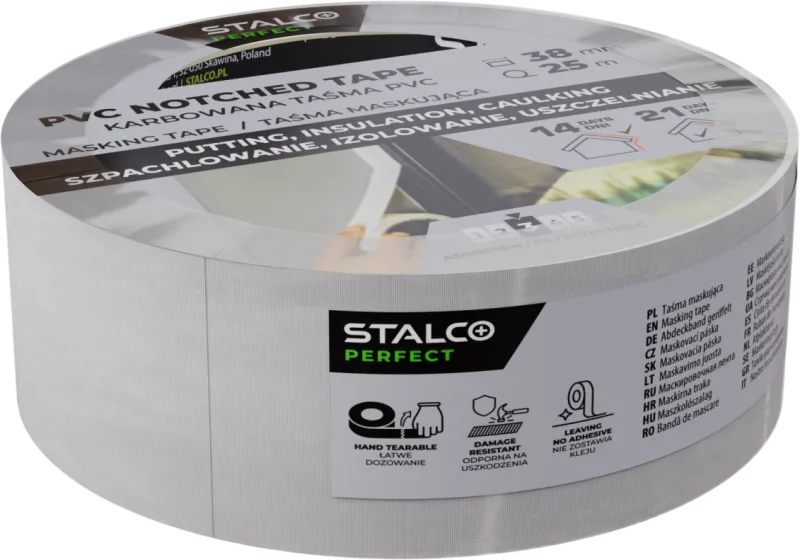 Špecializovaná vlnitá PVC páska STALCO PERFECT (48 mm x 25 m). UV odolná (14 dní), ľahko sa trhá rukou. Ideálna na ochranu okien pri omietaní a aplikácii peny. Priľnavosť 3/5.
