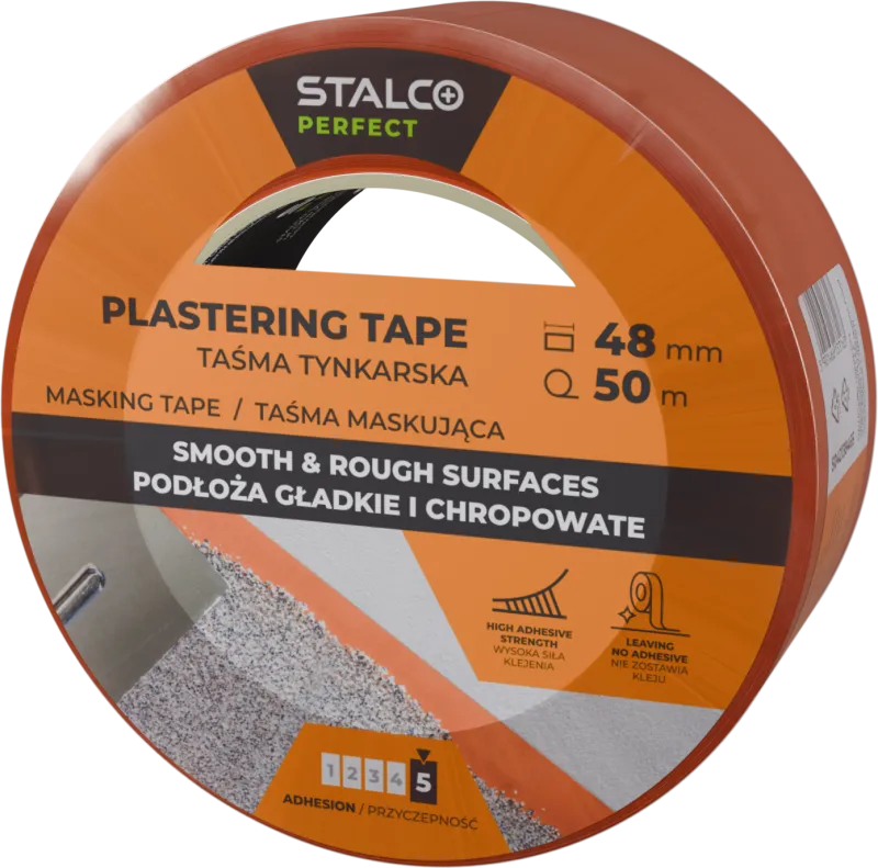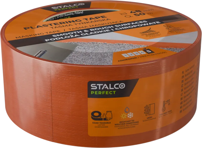 Omietkárska maskovacia páska STALCO PERFECT je profesionálna ochranná páska určená na intenzívne murárske a omietkárske práce, napr. pri zatepľovacích systémoch budov. Je vyrobená z odolného polyetylénového (PE) nosiča vystuženého sieťovinou z vlákien a pokrytá kaučukovým lepidlom typu hot-melt. Vyznačuje sa mimoriadnou odolnosťou voči poveternostným vplyvom, UV žiareniu a premenlivým poveternostným podmienkam. Vďaka extrémne vysokej sile lepenia (5/5) dokonale priľne na hladké aj drsné povrchy, ako sú fasádne omietky, betón, tehla, kameň alebo drevo. Možnosť ručného odtrhnutia uľahčuje aplikáciu a čisté odstránenie bez stôp lepidla umožňuje zachovať estetiku chránených prvkov.