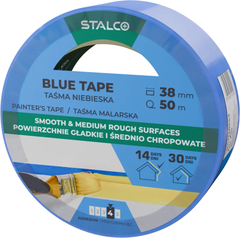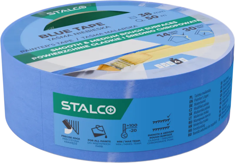 Profesionálna maliarska páska STALCO PERFECT (38 mm x 50 m) určená na striekanie a omietanie. Zaručuje precízne, ostré hrany bez podtekania. Odolná voči UV (14 dní), nezanecháva lepidlo.
