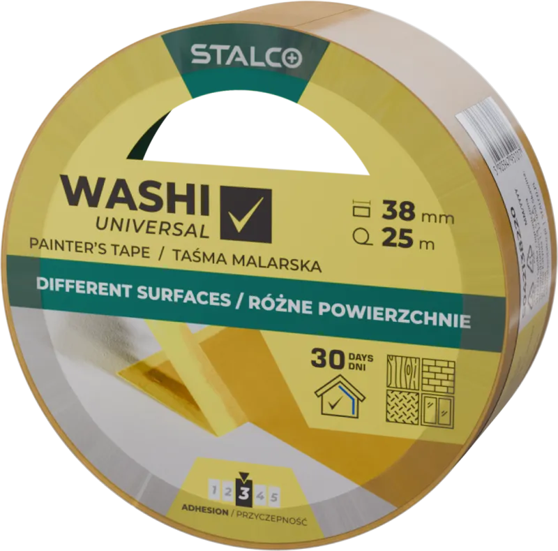 Univerzálna páska STALCO (38 mm x 25 m) z papiera Washi. Hydrofóbna, UV odolná, teplota do 130°C. Pre ostré hrany v interiéri aj exteriéri (odstránenie do 30 dní). Priľnavosť 3/5.