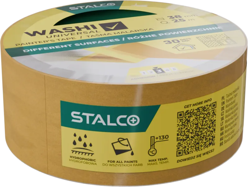 Univerzálna maliarska páska Washi UNIVERSAL od STALCO je určená pre všestranné maliarske a všeobecné stavebné práce. Spoľahlivo priľne k rôznym povrchom a po skončení prác sa odstraňuje čisto, bez stôp lepidla. Odolná štruktúra papiera washi s hydrofóbnou (vodoodpudivou) vrstvou pomáha dosiahnuť ostré, rovné hrany a účinne zabezpečovať povrchy. Je odolná voči UV žiareniu a vlhkosti.