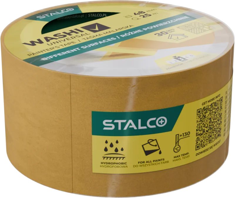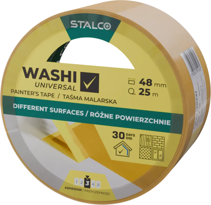 Univerzálna maliarska páska Washi UNIVERSAL od STALCO je určená pre všestranné maliarske a všeobecné stavebné práce. Spoľahlivo priľne k rôznym povrchom a po skončení prác sa odstraňuje čisto, bez stôp lepidla. Odolná štruktúra papiera washi s hydrofóbnou (vodoodpudivou) vrstvou pomáha dosiahnuť ostré, rovné hrany a účinne zabezpečovať povrchy. Je odolná voči UV žiareniu a vlhkosti.