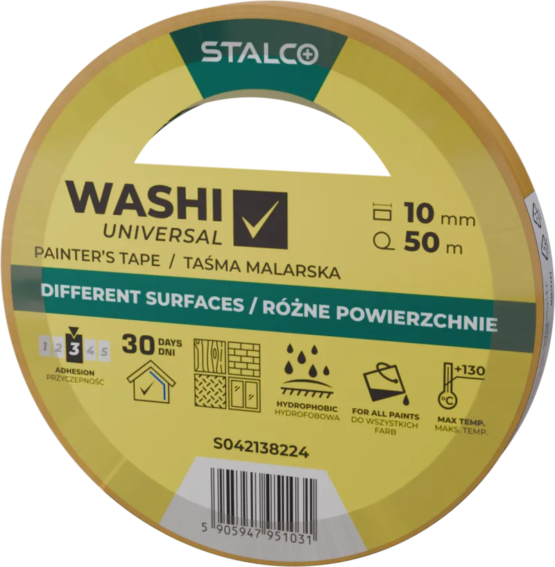 Univerzálna maliarska páska Washi UNIVERSAL od STALCO je určená pre všestranné maliarske a všeobecné stavebné práce. Spoľahlivo priľne k rôznym povrchom a po skončení prác sa odstraňuje čisto, bez stôp lepidla. Odolná štruktúra papiera washi s hydrofóbnou (vodoodpudivou) vrstvou pomáha dosiahnuť ostré, rovné hrany a účinne zabezpečovať povrchy. Je odolná voči UV žiareniu a vlhkosti.