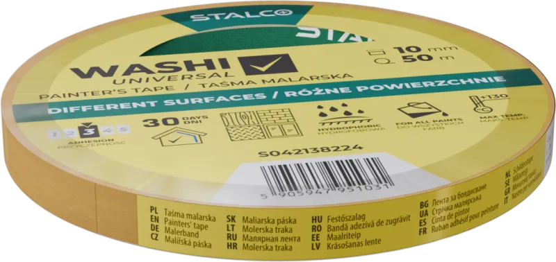 Univerzálna páska STALCO (10 mm x 50 m) z papiera Washi. Hydrofóbna, UV odolná, teplota do 130°C. Pre ostré hrany v interiéri aj exteriéri (odstránenie do 30 dní). Priľnavosť 3/5.