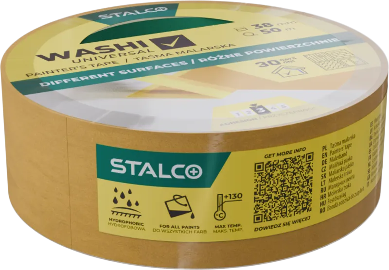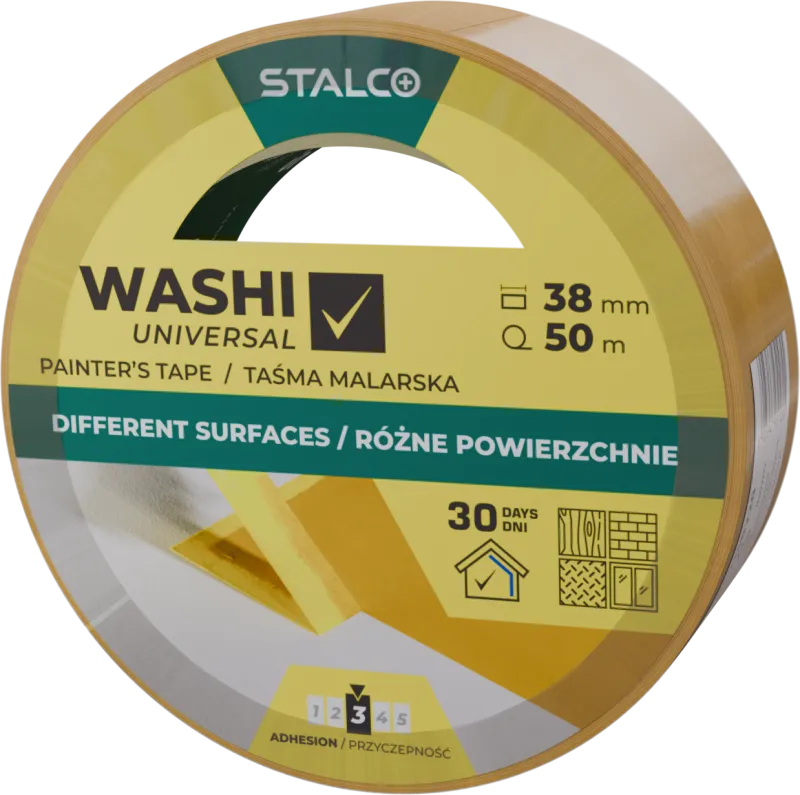 Univerzálna páska STALCO (38 mm x 50 m) z papiera Washi. Hydrofóbna, UV odolná, teplota do 130°C. Pre ostré hrany v interiéri aj exteriéri (odstránenie do 30 dní). Priľnavosť 3/5.