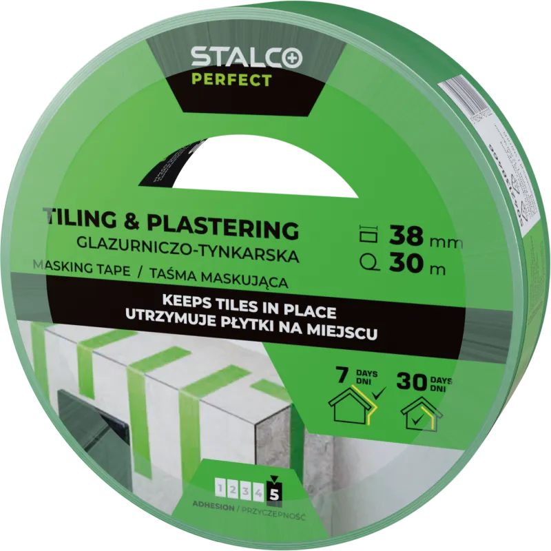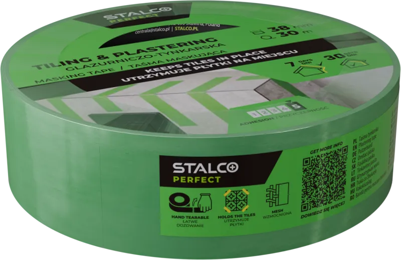 Obkladačsko-omietkárska maskovacia páska STALCO PERFECT je profesionálna páska určená pre dokončovacie práce, ktorá spája trvácnosť a extrémne vysokú silu lepenia (5/5) s presnosťou. Je ideálna na dočasnú stabilizáciu a zabezpečenie obkladov, zrkadiel, líšt, zárubní a iných prvkov počas omietkarských a obkladačských prác. Nedeformuje sa ani nenaťahuje, čo zaručuje udržanie prvkov v požadovanej polohe. Vďaka silnému lepidlu sa dokonale osvedčila na hladkých aj drsných povrchoch, ako sú omietky, betón, tehla alebo dlažba. Je ľahko odtrhnuteľná rukou a po odstránení nezanecháva stopy lepidla.