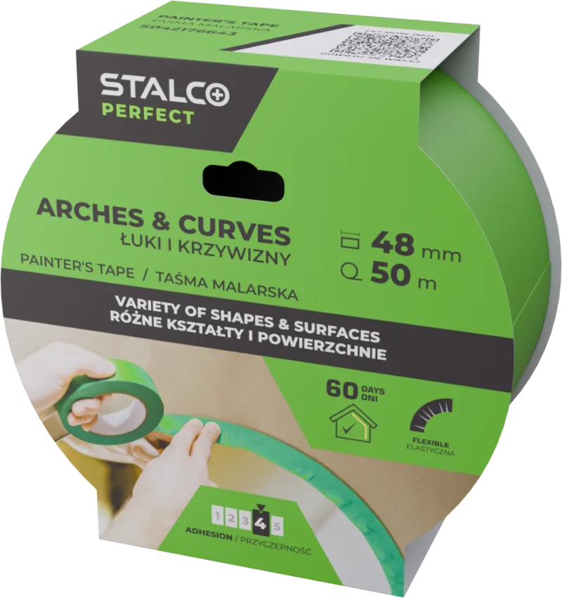 Flexibilná maliarska páska STALCO PERFECT 48 mm x 50 m na maľovanie oblúkov a kriviek. Extrémne elastický krepový papier pre ostré hrany. UV odolná (30 dní), teplotná odolnosť 110°C.
