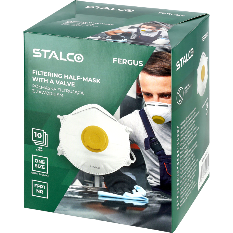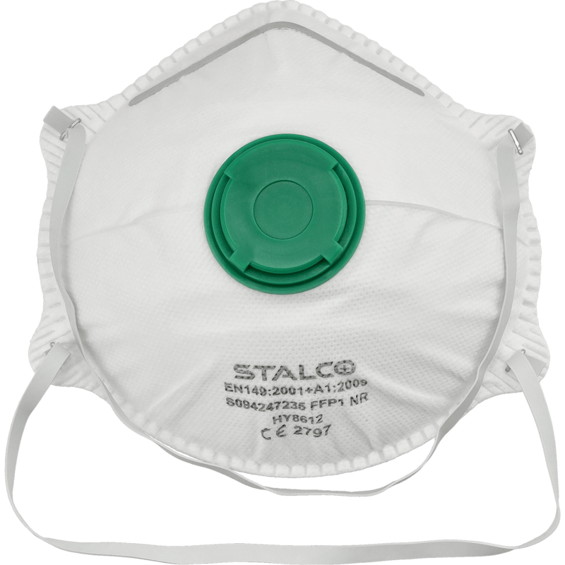 Jednorazový respirátor FFP1 STALCO FERGUS s výdychovým ventilom. Chráni pred prachom a aerosólmi, znižuje vlhkosť pri dýchaní. Ideálny pre chemický, stavebný či farmaceutický priemysel.