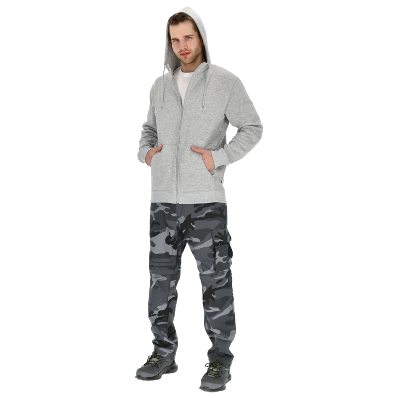 Univerzálna pracovná mikina PORA s kapucňou a zipsom v tmavosivej farbe. Vyrobená z pohodlnej bavlnenej zmesi (280 g/m²) s česanou vnútornou stranou. Voľný strih a robustný zips zaručujú komfort a odolnosť.